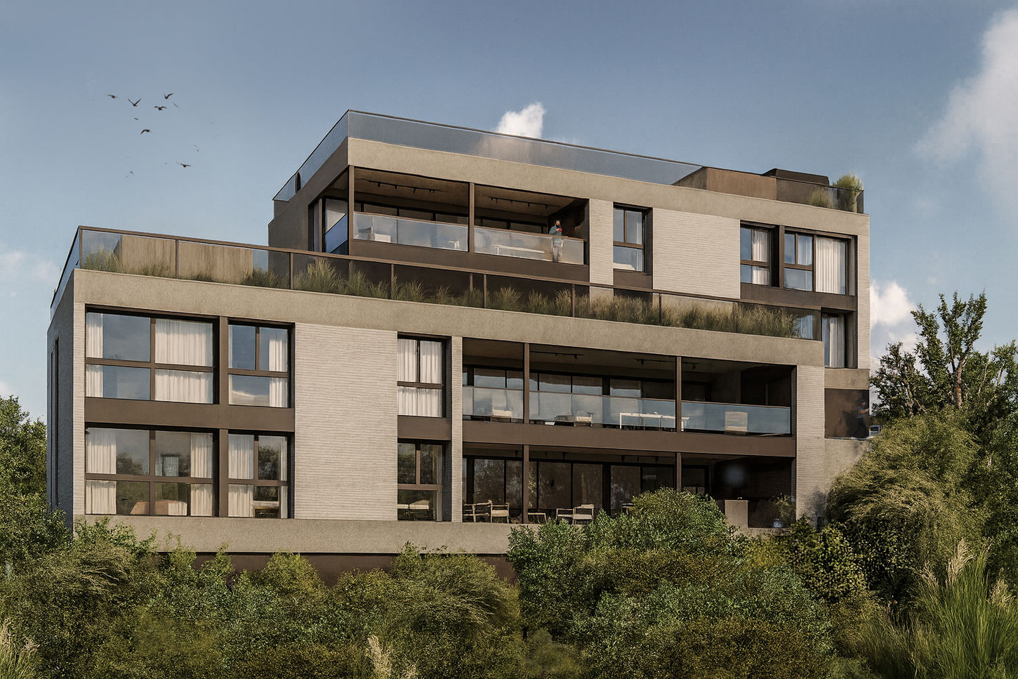 La fuerte pendiente del terreno se convirtió en aliada: cada unidad se distribuyó en un nivel independiente y los volúmenes se desfasaron en dos bloques semienterrados. Esto no solo permitió terrazas privadas con pileta en los niveles intermedios, sino también que la escala del conjunto se lea desde la calle como la de una vivienda unifamiliar, en sintonía con el barrio.