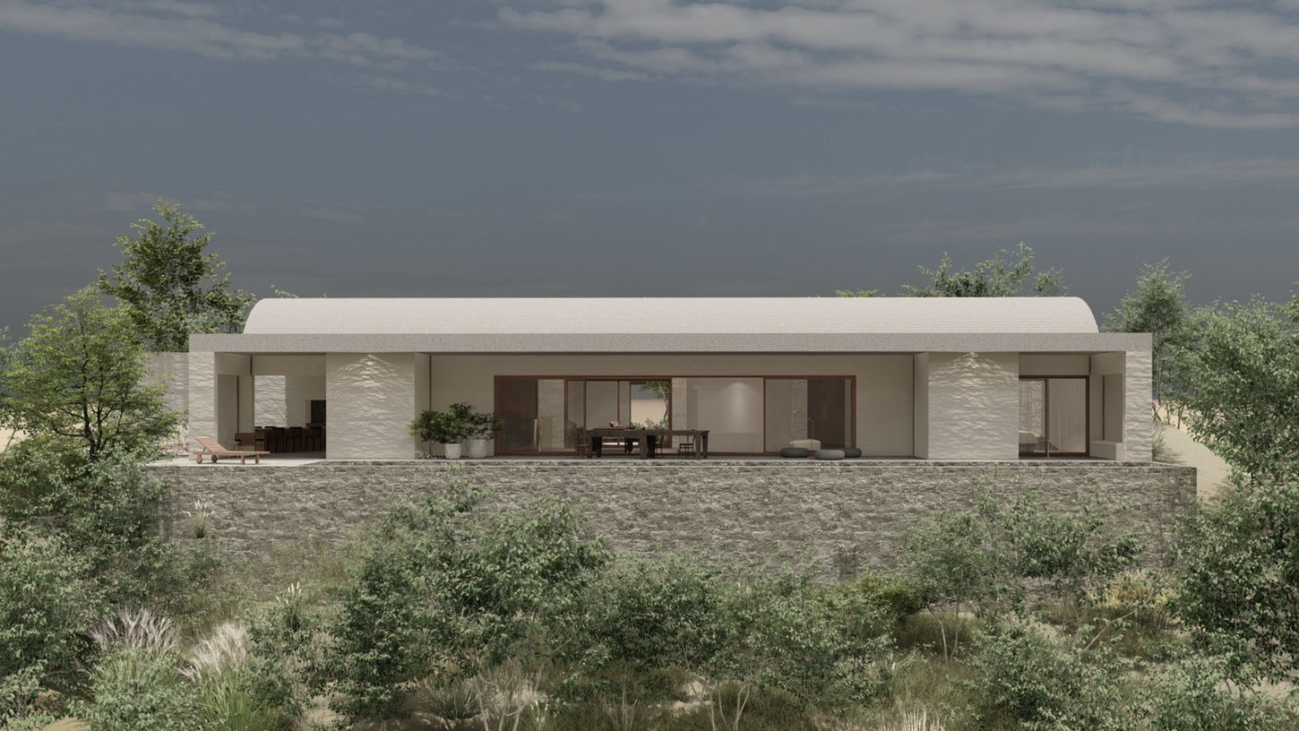 La vivienda se apoya sobre un basamento de piedra que dialoga con la topografía de la ladera y le confiere solidez. Sobre él, se despliega un volumen de líneas puras y cubiertas planas en sectores privados y abovedada en sector social, que envuelve los ambientes principales, aportando una atmósfera cálida y serena.